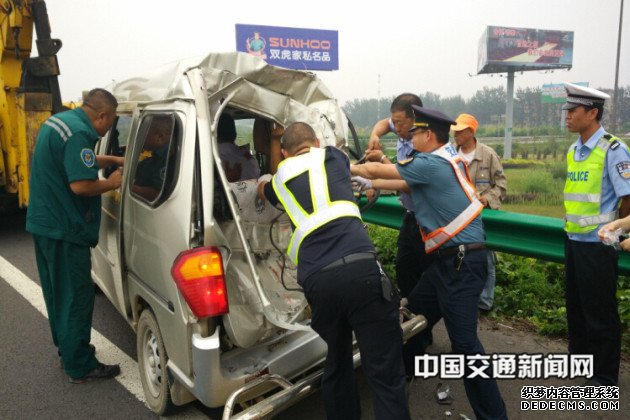7月22日11時(shí)28分,在沈陽方向K276+100處的事故現(xiàn)場(chǎng),京秦支隊(duì)秦皇島大隊(duì)執(zhí)法人員姜大亮,正與其他救援人員一起,把受傷乘客從事故車中搶救出來。當(dāng)日上午,秦皇島大隊(duì)執(zhí)法人員高煥新、姜大亮,在巡查至沈陽方向K276+100處時(shí),發(fā)現(xiàn)一輛貨車與一輛面包車發(fā)生了追尾事故,雖然現(xiàn)場(chǎng)無路損,但是,經(jīng)現(xiàn)場(chǎng)調(diào)查,倆執(zhí)法人員發(fā)現(xiàn):被追尾的面包車?yán)铮腥耸軅?,該車后排座椅竟然還卡住了2名受傷乘客,情況緊急。