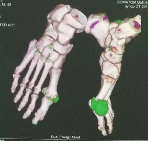 2015年9月,北京大學人民醫(yī)院風濕免疫科張學武教授的門診,來了一位姓劉的患者。額頭上有一塊傷疤,胳膊上有一圈結痂了的牙印兒。這是怎么回事?原來,老劉的痛風關節(jié)炎發(fā)作了,疼的難以忍受。每當痛風發(fā)作,他就撞墻、咬胳膊。這傷就是這么來的。老劉說,痛風疼起來連被單都蓋不上、一陣風從關節(jié)上刮過去都受不了。 提到痛風,大家一定會說是吃出來的。的確,痛風與長期大量進食高嘌呤的飲食密切相關。可是您知道嗎?痛風可不全都是吃出來的。張學武教授說,在他每周的痛風專業(yè)門診當中,就有這樣一部分患者,平時嘴管的很嚴從來都不亂吃,可還是沒能逃過痛風的魔掌。他們的痛風究竟是何因所致?這篇文章將顛覆您對痛風的認識。 【正文】 因素一:運動不合理 運動是把雙刃劍:不運動易痛風,運動過量也痛風 先來說,為什么不運動會造成痛風。張學武教授說,因為適量的運動可以加速新陳代謝,有利于尿酸的排泄。運動量少就容易造成血尿酸代謝不暢,引發(fā)高尿酸血癥。一些慢性疾病,如高血壓、糖尿病、高血脂、肥胖等,也喜歡“盯上”不愛運動的人。而高血壓、高血脂、糖尿病、肥胖、高尿酸血癥都是痛風的高危因素。所以通過適量的運動,不僅血尿酸會適當降低,高血壓、高血脂等痛風的高危因素也會得到改善。 再來說為什么運動過量也會造成痛風。張學武教授說,他近30年的從醫(yī)經(jīng)歷,由于運動過量來就診的痛風患者也不在少數(shù),這其中有一部分是運動員,我們不妨通過運動員的例子,來說明過量運動為什么會造成痛風。 有關運動和尿酸之間關系曾有一項調查研究:一群20到24歲的大學生在運動前及10分鐘激烈運動后,分別抽血檢查血中尿酸值的平均值:以運動前之血清尿酸值為基準,運動一小時后+93.6μmol/l,二小時+113.4μmol/l為最高,三小時+82.8μmol/l逐漸再下降,五小時+76.8μmol/l,七小時+53.4μmol/l漸漸恢復,二十四小時后為-10.8μmol/l,已恢復到運動前的正常值??梢娺\動后,尿酸有一過性增高,在24小時之后即可恢復正常。 但運動員每天都要做很多的訓練,尿酸值還沒等恢復到正常,又開始第二天的激烈訓練,血尿酸一直處于增高狀態(tài)。而激烈運動還會造成乳酸堆積,乳酸堆積會使血里、尿里的狀態(tài)偏酸。尿酸最容易排泄的PH值是6.5,劇烈運動后體內的尿酸PH值通常小于6.5。 再加上運動員為了維持高強度運動,他們的飲食當中蛋白質和糖類較多,易出現(xiàn)脂類和糖代謝異常,使發(fā)生痛風的危險因素增加。而多數(shù)運動員退役后運動量不如原先那么大,所以造成了體重增長過快,加上吃的又多,關節(jié)在原先的運動當中有過損傷,所以運動員也是痛風的高危人群。 受過損傷的關節(jié)更易患痛風 還有一個重要的原因,就是運動員經(jīng)常受傷。大家都知道,痛風關節(jié)炎的首發(fā)位置通常在第一跖趾關節(jié)(如上圖)。而有一部分人的痛風關節(jié)炎首發(fā)卻不在這個位置,而是在膝關節(jié)、踝關節(jié),甚至是手腕和肘關節(jié)。因為痛風有個特點,有過損傷的關節(jié),更容易發(fā)生或更早發(fā)生痛風。比如有肘關節(jié)炎癥、骨折史,崴了腳等。足球運動員總用腳趾踢球,所以痛風好發(fā)于腳趾關節(jié)。這樣的關節(jié),它的結構發(fā)生了變化,尿酸更容易往這樣的關節(jié)上沉積,就像血管里有一些斑塊之后就容易發(fā)生血栓。正常男性的血尿酸值是428μmol/l,很多尿酸高的人可能在600μmol/l才開始發(fā)作痛風關節(jié)炎。而一旦有關節(jié)損傷,也許500μmol/l痛風關節(jié)炎就會發(fā)作。 張學武教授說,除了崴腳之外,使勁揉、按摩關節(jié)、蒸桑拿,關節(jié)局部的尿酸鹽就容易快速析出,痛風就容易發(fā)作。如果您的尿酸高,又有關節(jié)損傷,更應關注自己的血尿酸水平,每半年檢查一次血尿酸,并注意不要發(fā)生關節(jié)損傷。 關節(jié)不負重的運動方式最適合痛風患者 張學武教授說,痛風患者的運動原則是保護關節(jié)。應該選擇關節(jié)不負重的運動方式,比如游泳、散步、跳舞、騎車。需要提醒您的是,再好的運動也要適量。曾經(jīng)有位男性痛風患者,是個老板。得了痛風之后治病心切,特別在意自己的病,飲食上很注意控制。他聽說游泳是痛風患者的最佳運動方式,就連續(xù)游了5個小時。沒想到他痛風又發(fā)作了,一個星期沒能下來床,腳腫了三號,疼痛難忍,生意也都給耽誤了。 區(qū)分痛風和其他關節(jié)炎的簡便辦法 出現(xiàn)關節(jié)疼痛的時候,如何區(qū)分是痛風關節(jié)炎還是其他關節(jié)炎導致?張學武教授說,痛風常常是單關節(jié)的紅腫熱痛,疼痛往往只在一側。而其他關節(jié)炎如類風濕關節(jié)炎,通常是雙側關節(jié)呈對稱樣疼痛。 再就是到醫(yī)院通過一些輔助檢查手段,也可以準確判斷是不是痛風關節(jié)炎。如B超。痛風關節(jié)炎通常在B超下顯現(xiàn)出“雙軌征”,就是在關節(jié)軟骨的上面和下面分別有兩條亮線。而別的關節(jié)炎則沒有這種特征。還有一種輔助檢查手段是通過雙源CT來看關節(jié)。雙源CT通過顏色的變化,能顯示出關節(jié)中存在的尿酸鹽結晶。痛風關節(jié)炎通常會在檢查中看到綠色的東西,這就是過多的尿酸鹽結晶。而其他關節(jié)炎,如類風濕關節(jié)炎,則顏色偏紅。