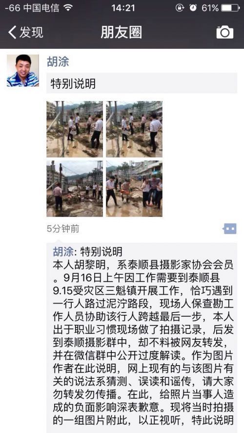 拍攝者發(fā)布“特別說明” 胡黎明是這張圖片的拍攝者,他也是保險公司的工作人員。他告訴記者,他當時拍下了這張照片,并隨手發(fā)到了一個攝影群里,結果沒想到最后被傳成這樣。 今天下午在他的朋友圈發(fā)布了“特別說明”: 本人胡黎明,系泰順縣攝影家協(xié)會會員。9月16日上午因工作需要到泰順縣9.15受災區(qū)三魁鎮(zhèn)開展工作,恰巧遇到一行人路過泥濘路段,現(xiàn)場人保查勘工作人員協(xié)助該行人跨越最后一步,本人出于職業(yè)習慣現(xiàn)場做了拍攝記錄,后發(fā)到泰順攝影群中,卻不料被網友轉發(fā),并在微信群中公開過度解讀。作為圖片作者在此說明,網上現(xiàn)有的與該圖片有關的說法系猜測、誤讀和謠傳,請大家勿轉發(fā)勿傳播。在此,給照片當事人造成的負面影響深表歉意?,F(xiàn)將當時拍攝的一組圖片附此,以正視聽,特此說明。 胡黎明說,當時他跟同事一起去處理保險理賠的事務,地點就在三魁鎮(zhèn)薛宅村,“我當時拍這個是想體現(xiàn)災情面前人與人之間相互救助,沒想到最后完全變了味道,這是被人過度解讀了。” (責任編輯:admin) |