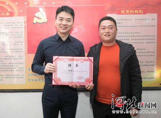 11月28日,劉強東(左)從阜平縣平石頭村黨支部書記顧路紅手中接過名譽村主任聘書。 李秀芹攝 河北新聞網(wǎng)11月28日訊(通訊員沈振 記者潘文靜)今天,阜平縣平石頭村村委會正式聘