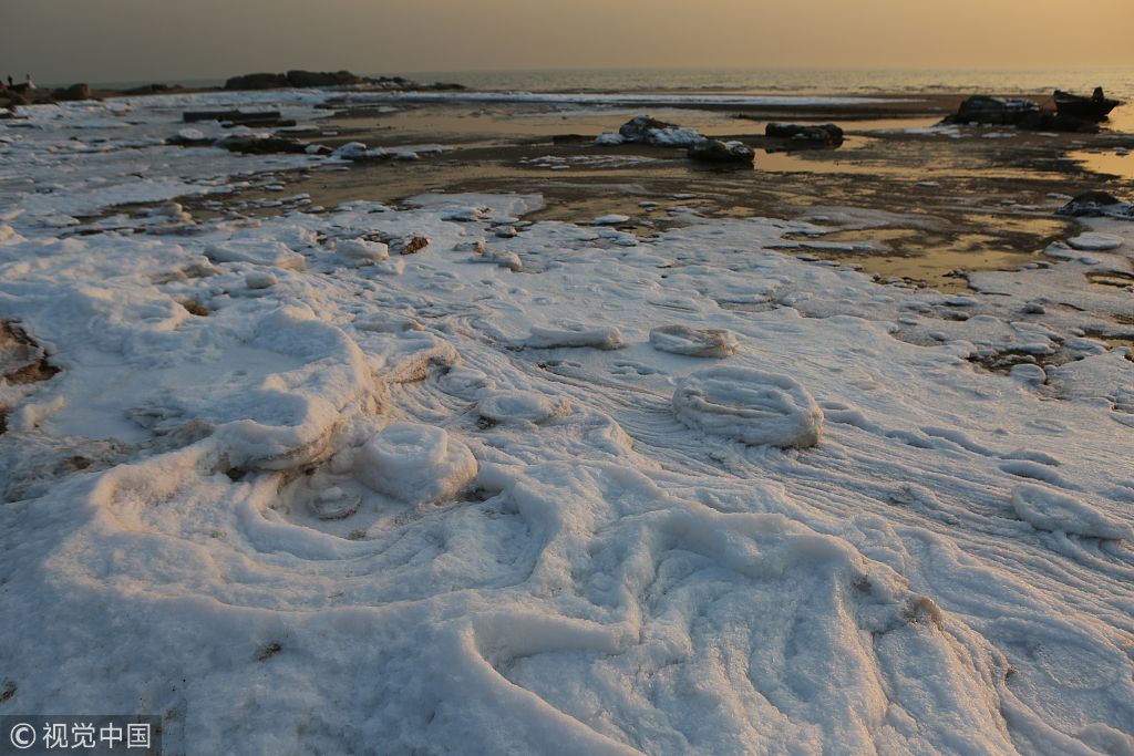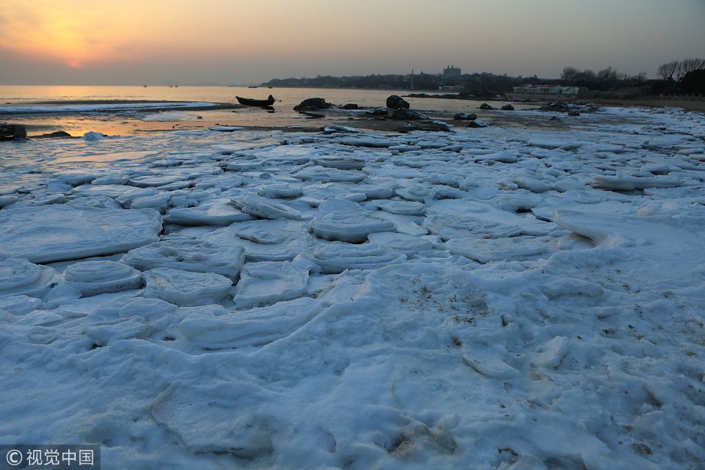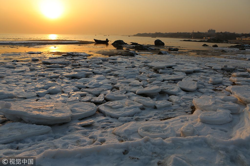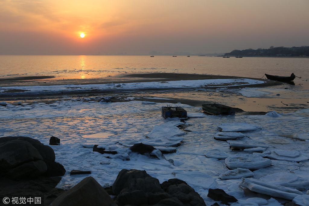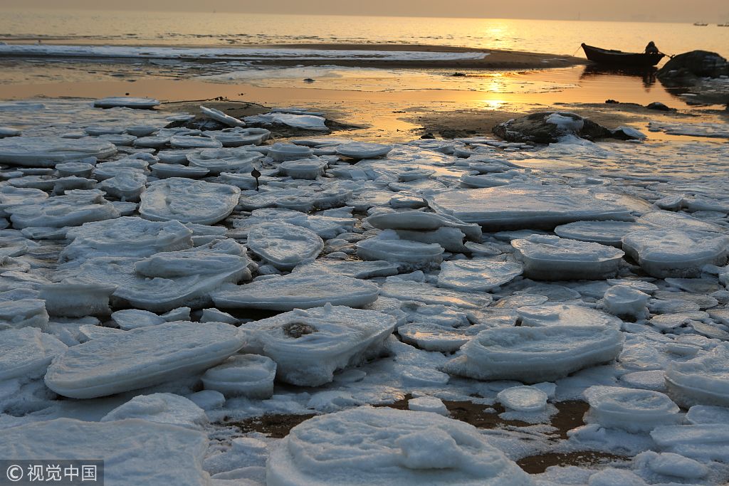 2018年1月18日,河北秦皇島,“四九”第一天北戴河,盡管今年海冰的規(guī)模不是很大,但夕陽下海冰還是別具特色的一道風景。圖片來源:丹尼/視覺中國