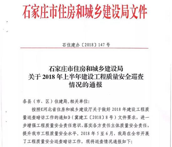 近日,石家莊市住房和城鄉(xiāng)建設(shè)局網(wǎng)站發(fā)布《關(guān)于2018年上半年建設(shè)工程質(zhì)量安全巡查情況的通報》,2018年5至6月,該局在全市 進行 工程質(zhì)量安全巡查暗訪工作,對 施工現(xiàn)場質(zhì)量安全、