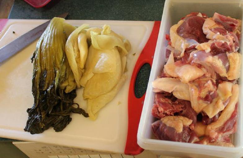 Step1.鴨肉切片。酸菜葉梗和葉片分開(kāi),都切成細(xì)條狀。因?yàn)榕笥央绲乃岵瞬幌?,所以不用過(guò)水川燙去掉咸味。如果買(mǎi)來(lái)的酸菜太咸,還是需要過(guò)水一下。