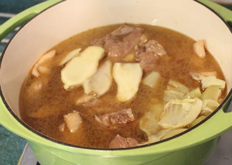 Step4.將炒好的鴨肉放入燉鍋,加水蓋過(guò)鴨肉,放入酸菜葉梗、姜片、和米酒,煮滾后,蓋上蓋子轉(zhuǎn)小火,燉煮約30分鐘。