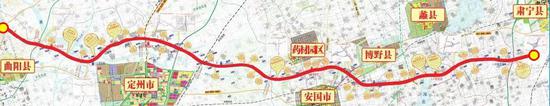 項(xiàng)目一期工程起自保定市曲陽(yáng)縣境內(nèi)京昆高速公路互通,與規(guī)劃的淶曲高速公路順接,終于滄州市肅寧縣境內(nèi)大廣高速公路互通,全長(zhǎng)92.171公里,線路途經(jīng)曲陽(yáng)縣、唐縣、定州市、安國(guó)市、博野縣、蠡縣、肅寧縣7個(gè)縣市。