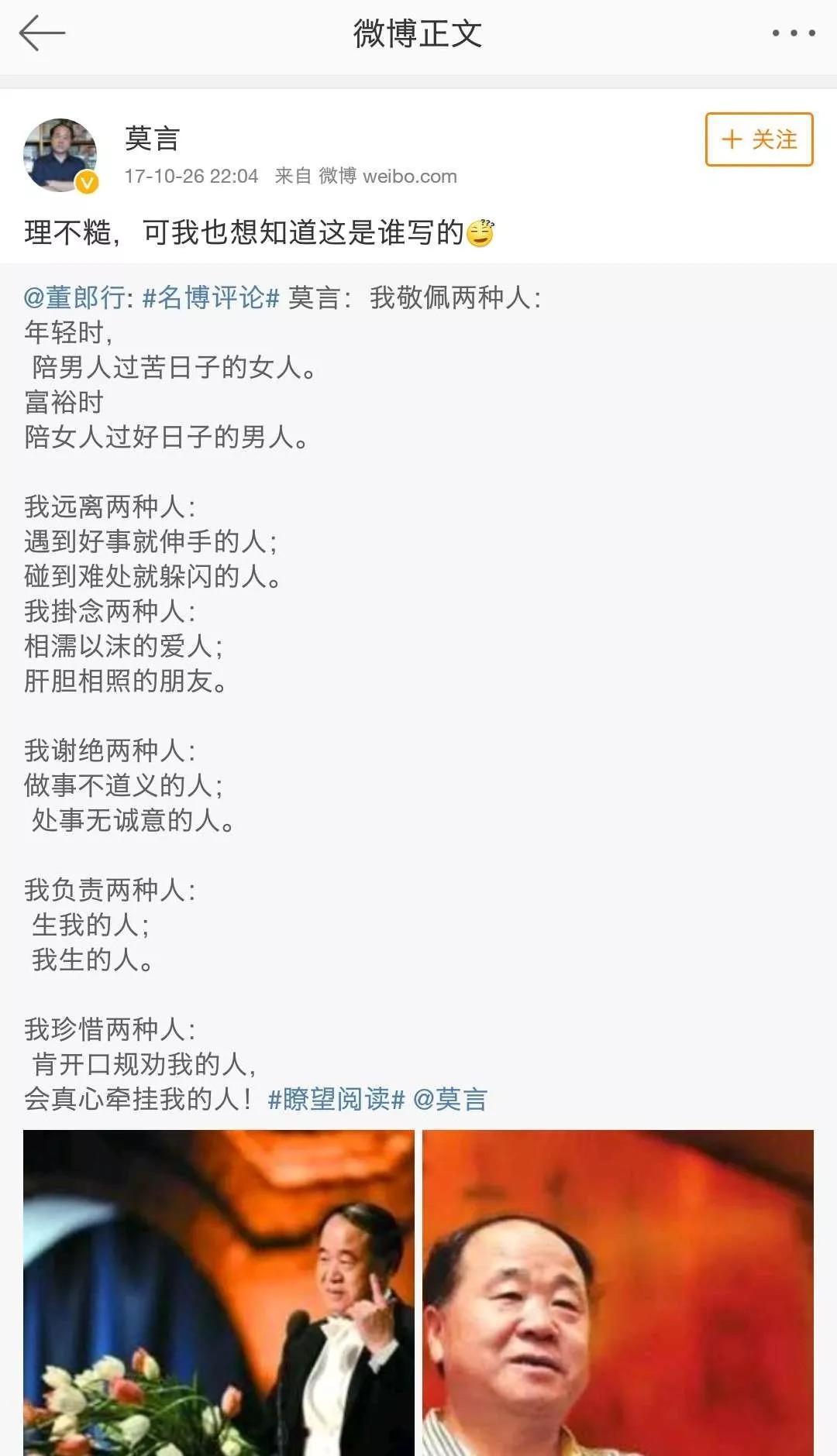 去年,有博主發(fā)"心靈雞湯"并@莫言,被作家莫言"打臉",曾引發(fā)關(guān)注。
