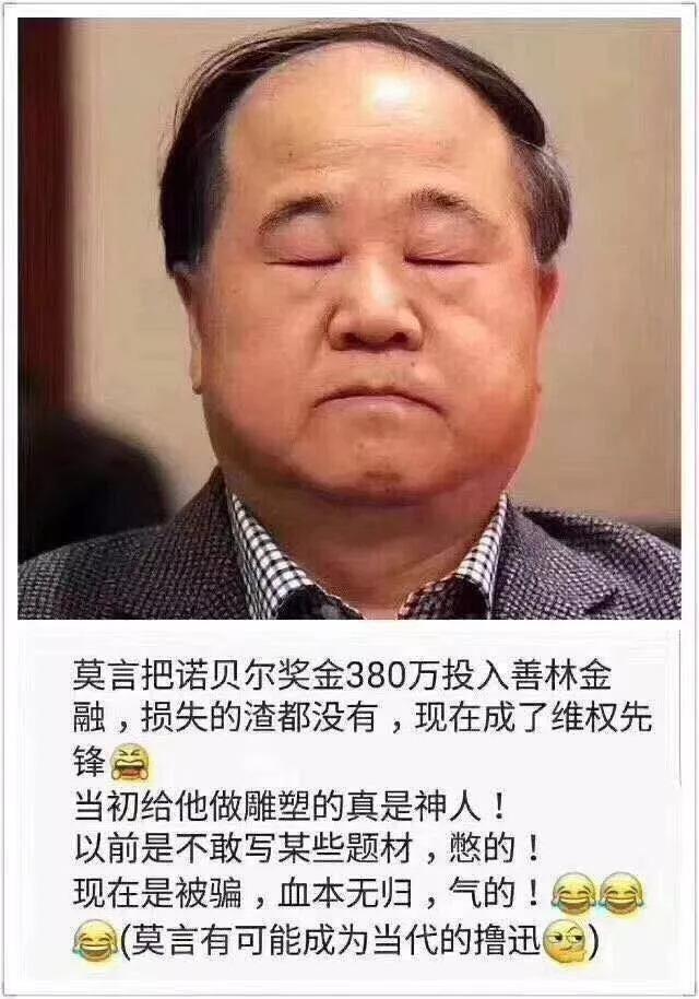 近日,莫言又"躺槍"。網(wǎng)絡(luò)上流傳著一張"莫言將諾貝爾文學(xué)獎獎金投資到善林金融,虧的渣都不剩"的圖片。