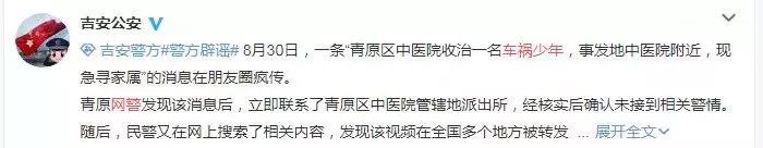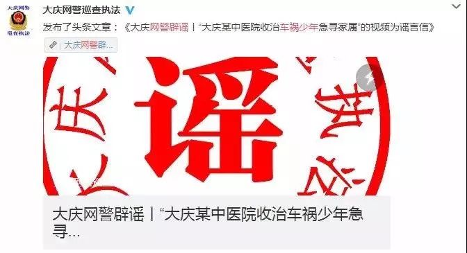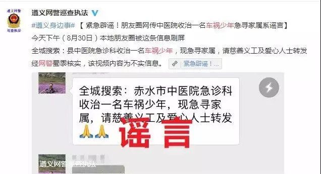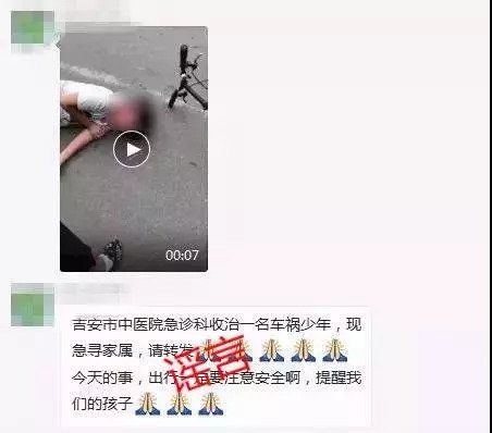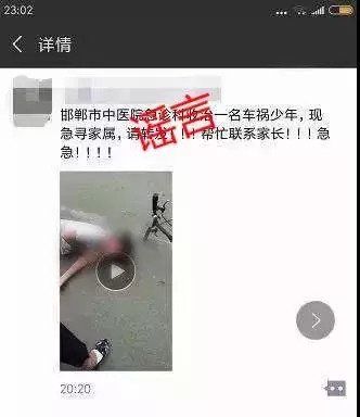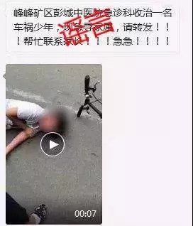 近日,多地微信群、朋友圈都在轉(zhuǎn)發(fā)一段視頻,網(wǎng)傳視頻僅6秒,視頻中一名男孩倒地,面部流血。并配文稱(chēng)“XX市中醫(yī)院急診科收治一名車(chē)禍少年,現(xiàn)急尋家屬……”